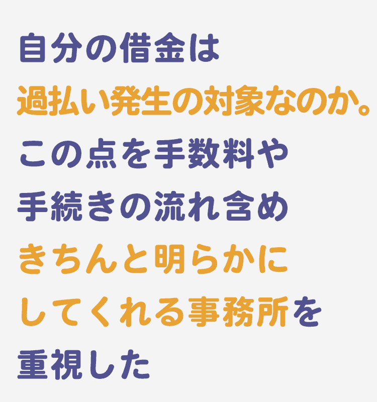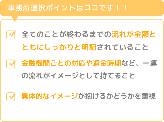 今回私が事務所選択でポイントとしたことは、最初の問い合わせから全てのことが終わるまでの流れが金額とともにしっかりと明記されていること、金融機関ごとの対応や返金時期など、一連の流れがイメージとして持てることでした。