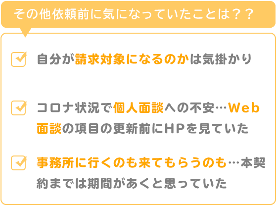 現在のWeb面談の項目が更新される前にホームページを見ていたので、事務所に向かうのもこちらへ来てもらうのも無理だろうから、本契約までは期間があいちゃうんだろうなと思ってました。