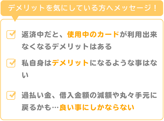 現在、返済中での相談だと、使っているカードが利用出来なくなるというデメリットはあります。