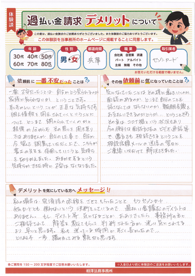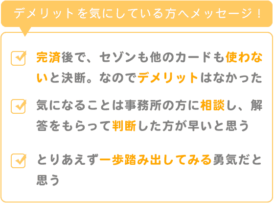私の場合は、完済後の依頼をさせてもらったことともうセゾンカード他のカードとも使わないという決断をしているので過払い金請求のデメリットはありません。