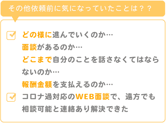 気になっていたことはどの様に進んでいくのか、面談があるのか、どこまで自分のことを話さなくてはならないのか報酬金額をお支払いできるのかどうか…ということです。