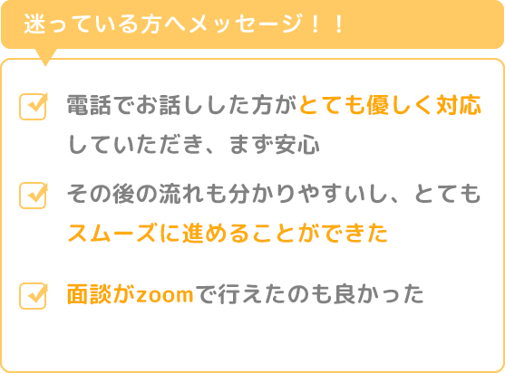 私もすごく迷って、勇気を出して問い合わせをしました。まず電話でお話しした方がとても優しく対応していただき、まず安心しました。