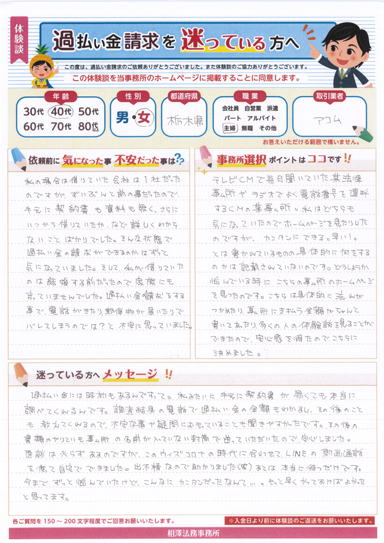 調査結果の電話で過払い金の金額もわかるし、その後のことも教えてくれるので、不安な事や疑問におもっていることも聞きやすかったです。