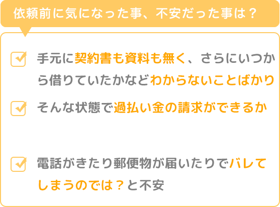そして、私が借りていたのは結婚する前だったので家族にも言っていませんでした。過払い金請求をする事で、電話がきたり郵便物が届いたりでバレてしまうのでは?と不安に思っていました。