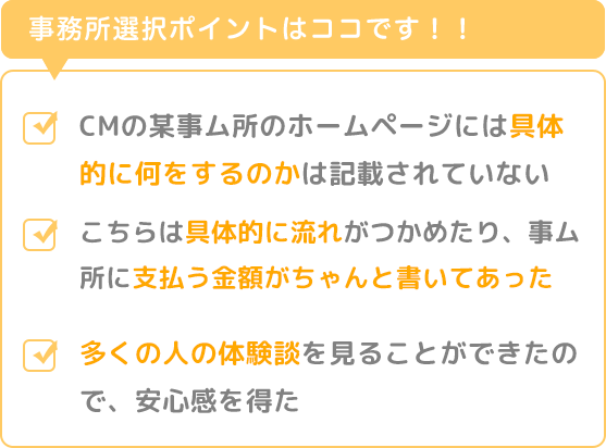 こちらは具体的に流れがつかめたり、事ム所に支払う金額がちゃんと書いてあったり、多くの人の体験談を見ることができたので、安心感を得たのでこちらに決めました。