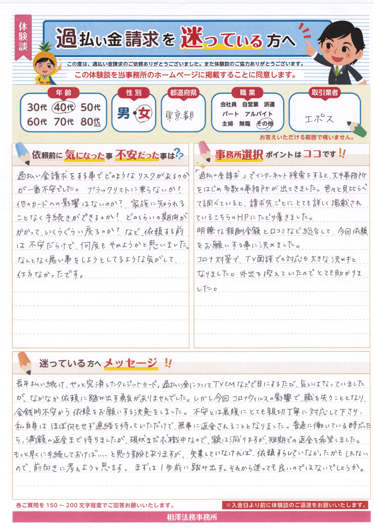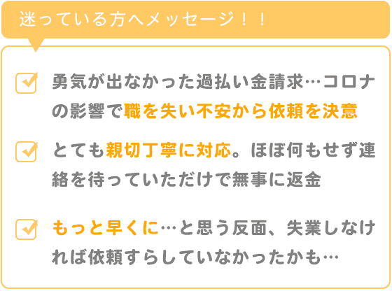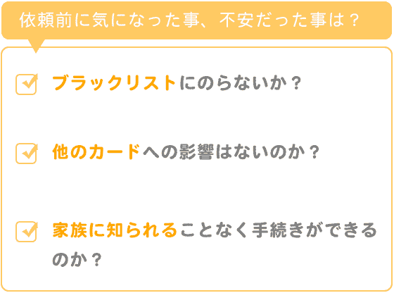 ブラックリストに乗らないか?他のカードへの影響はないのか?家族に知られることなく手続きができるのか?どのくらいの期間がかかって、いくらぐらい戻るのか?など、依頼する前は不安だらけで、何度もやめようかと思いました。