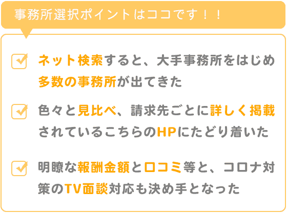 明瞭な報酬金額と口コミなど総合して、今回依頼をお願いする事に決めました。