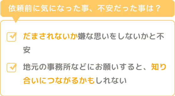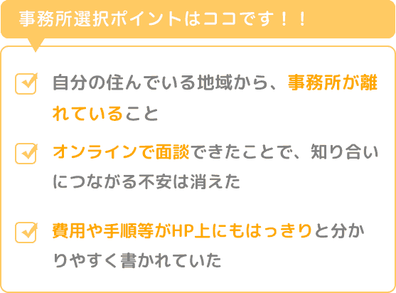 自分の住んでいる地域から、事務所が離れていること。オンラインで面談できたことで、知り合いにつながる不安は消えました。