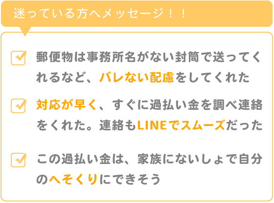 また、対応が早く、依頼してすぐに過払い金がどのくらいあるのか調べてくださったり、連絡をくださったりした。