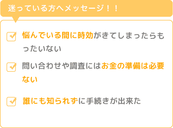 まず、勇気を出して問い合わせてみて下さい。問い合わせや調査にはお金の準備は必要ありませんし、誰にも知られずに手続きが出来ました。