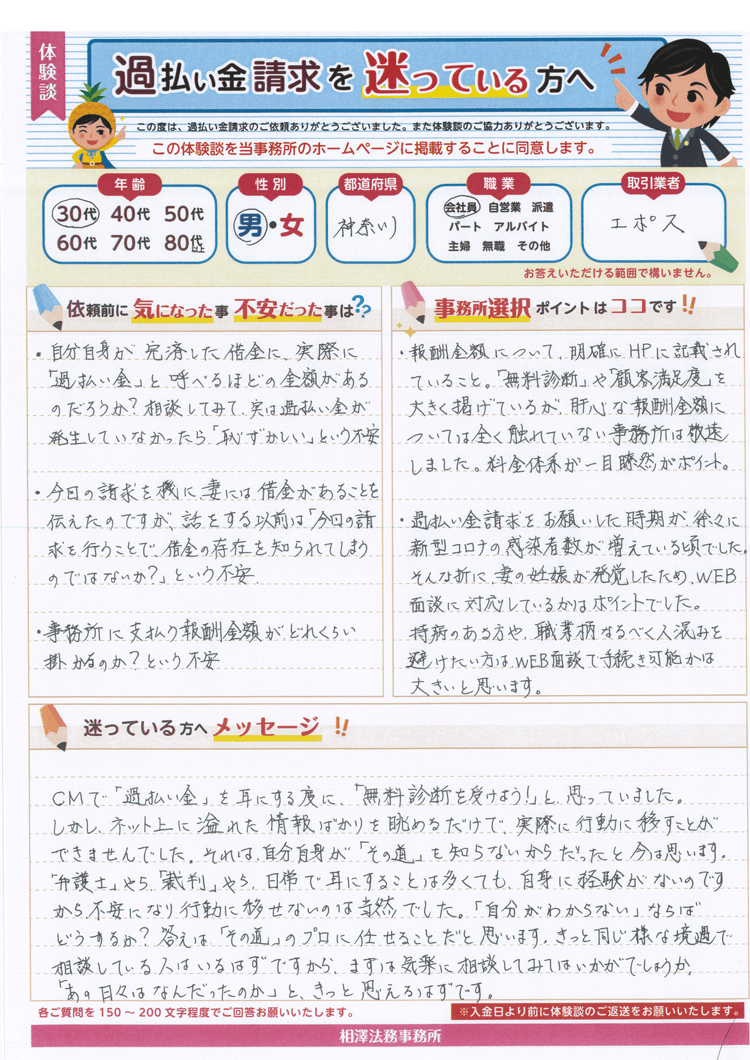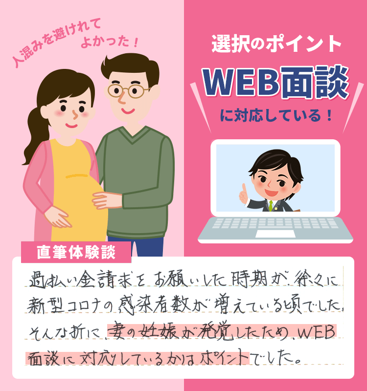 ・過払い金請求をお願いした時期が、徐々に新型コロナの感染者数が増えている頃でした。そんな折に、妻の妊娠が発覚したため、WEB面談に対応しているかはポイントでした。持病のある方や、職業柄なるべく人混みを避けたい方は、WEB面談で手続き可能かは大きいと思います。