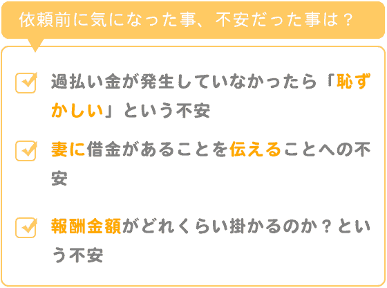 ・自分自身が完済した借金に、実際に「過払い金」と呼べるほどの金額があるのだろうか?相談してみて、実は過払い金が発生していなかったら「恥ずかしい」という不安