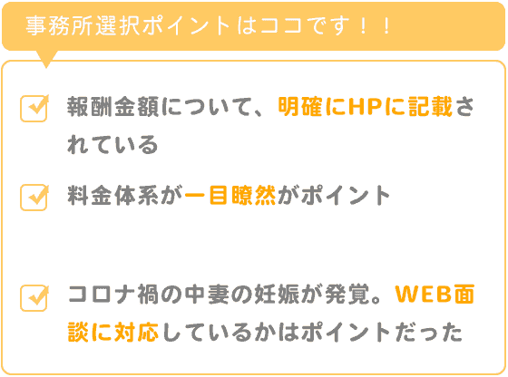 ・報酬金額について、明確にHPに記載されていること。「無料診断」や「顧客満足度」と大きく掲げているが、肝心な報酬金額については全く触れていない事務所は敬遠しました。料金体系が一目瞭然がポイント。