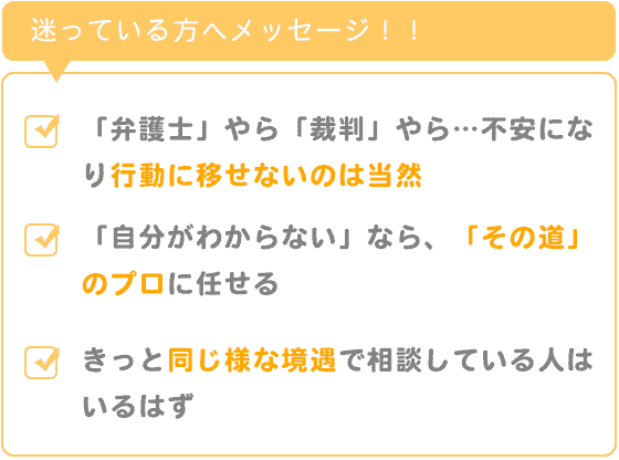 それは、自分自身が「その道」を知らないからだったと今は思います。「弁護士」やら「裁判」やら、日常で耳にすることは多くても、自身に経験がないのですから、不安になり行動に移せないのは当然でした。