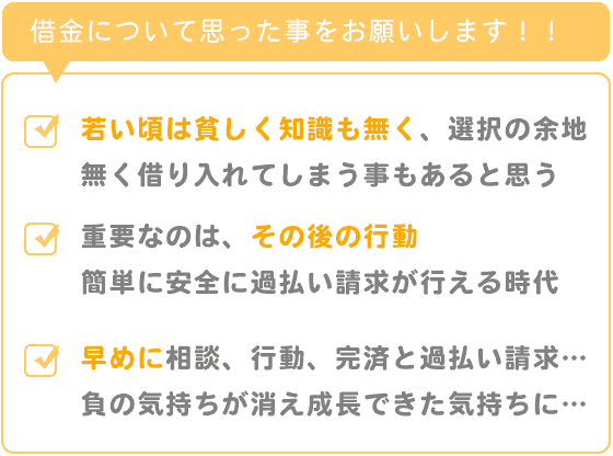 重要なのは、その後の行動で、こんなにも簡単に安全に過払い請求が行える時代ですので、早めに相談、行動し、完済と過払い請求を行なえば、負の気持ちが無くなり自身も成長できた気持ちになります。
