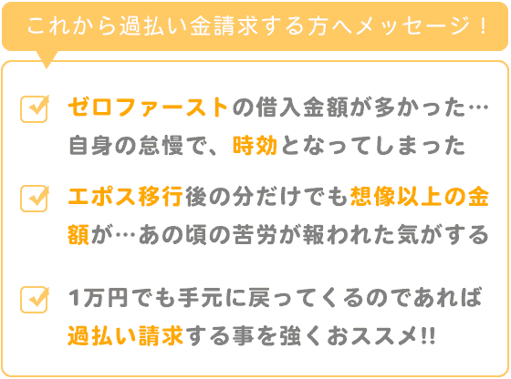 私は、ゼロファーストでの借り入れの方が金額が多かったのですが、自身の怠慢で、時効となってしまいましたが、エポス移行後の分だけでも、想像以上の金額が戻ってくるとの事で、大変嬉しく、あの頃の苦労が少し報われた気がしております。